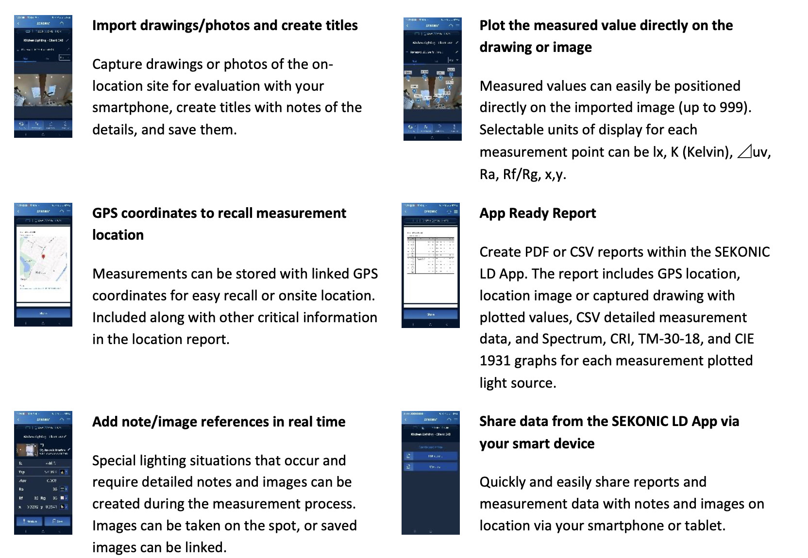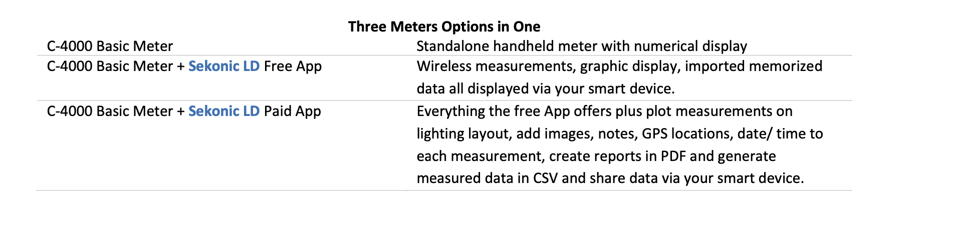 With the Sekonic LD upgraded PAID version of the App, a variety of features and functions are available at your fingertips, providing a smooth and convenient workflow. From a quick and easy measure and record process to sharable measurement reports on the fly, the Sekonic LD upgrade App compatible with Apple or Android smartphones or tablets offers the perfect extension to your C-4000 Spectrometer experience.