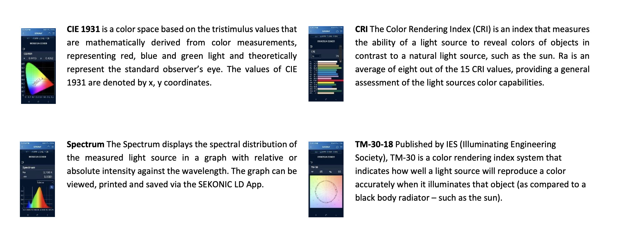 - Provides Light Quality information such as Ra, 𝛥uv, Lux/fc, TM-30-18 (Rf, Rg), Chromaticity coordinates (x,y) and more