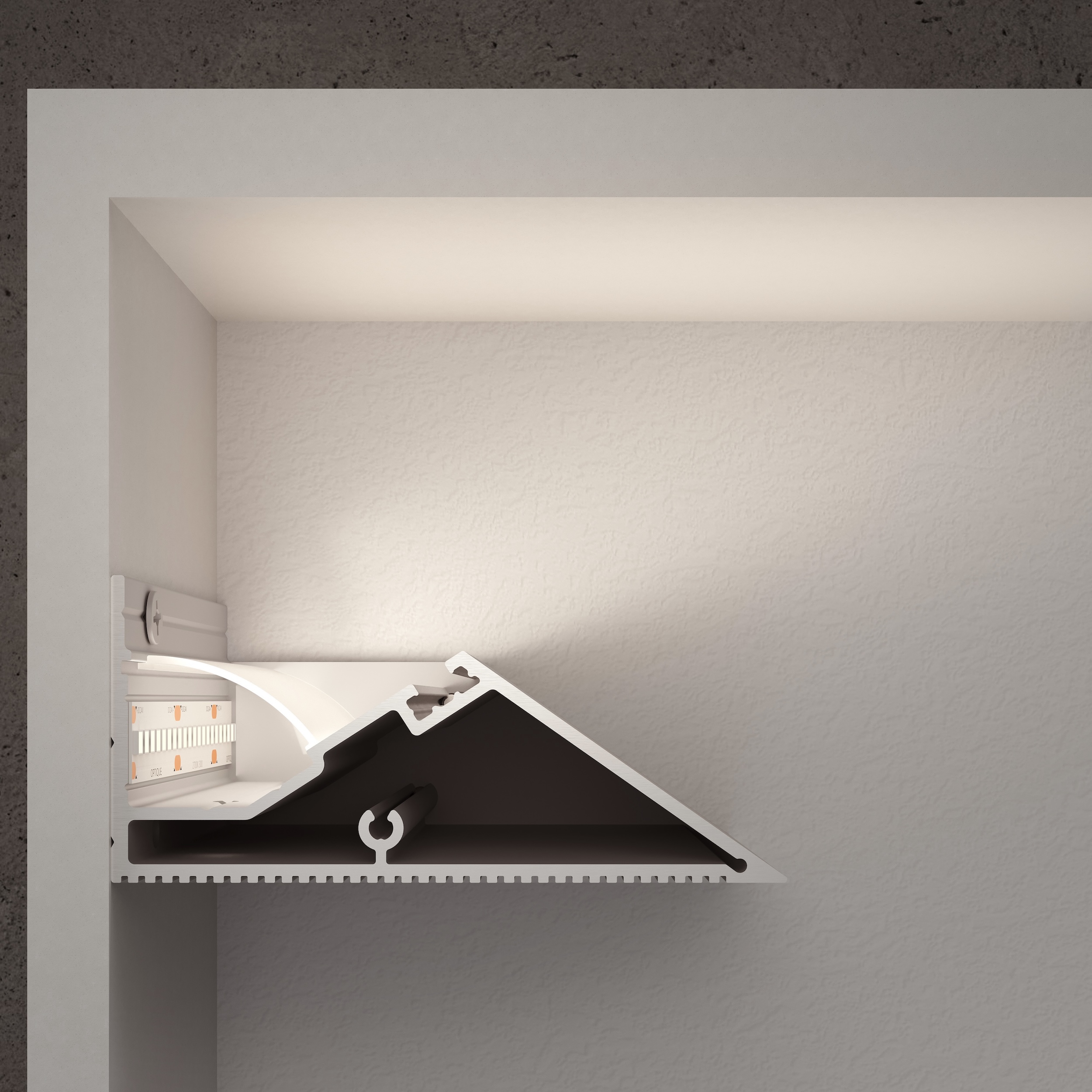The petite aluminum channel is only 2.03″ wide at the top and 3.90″ wide at the bottom and 1.77″ in height and can be mounted on a wall to create a cove lighting reveal or mounted to the ceiling to create a downlight cove reveal.