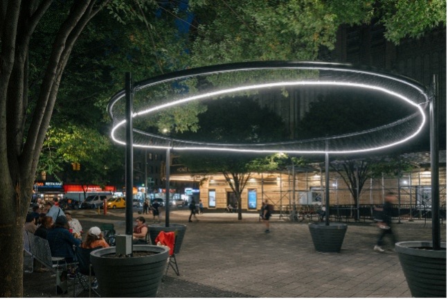 This site-specific installation is inspired by communal celebration in the public square, a cultural tradition deeply embedded in the neighborhood’s Latin American diaspora. Soft illumination from undulating circles transforms two public spaces, creating an inviting space for interaction while increasing nighttime visibility. Jury comment: This is a fun, joyful, and it defines the space through light.